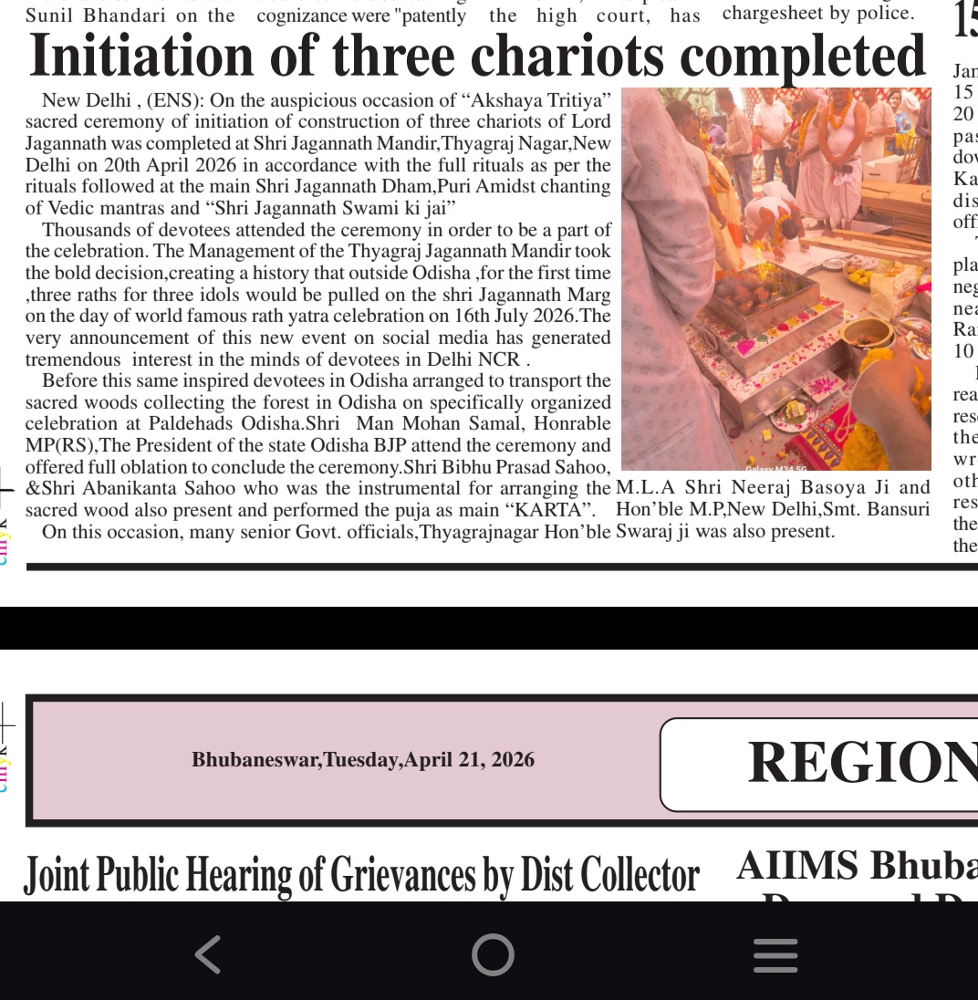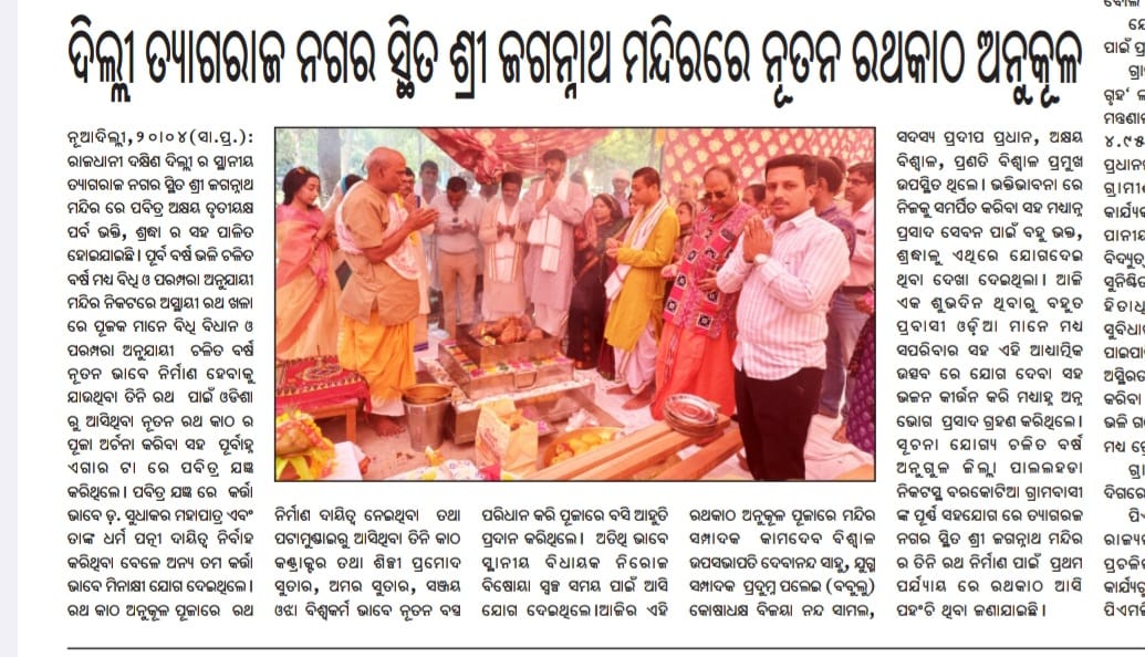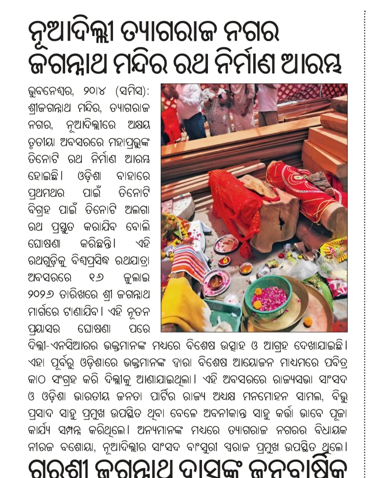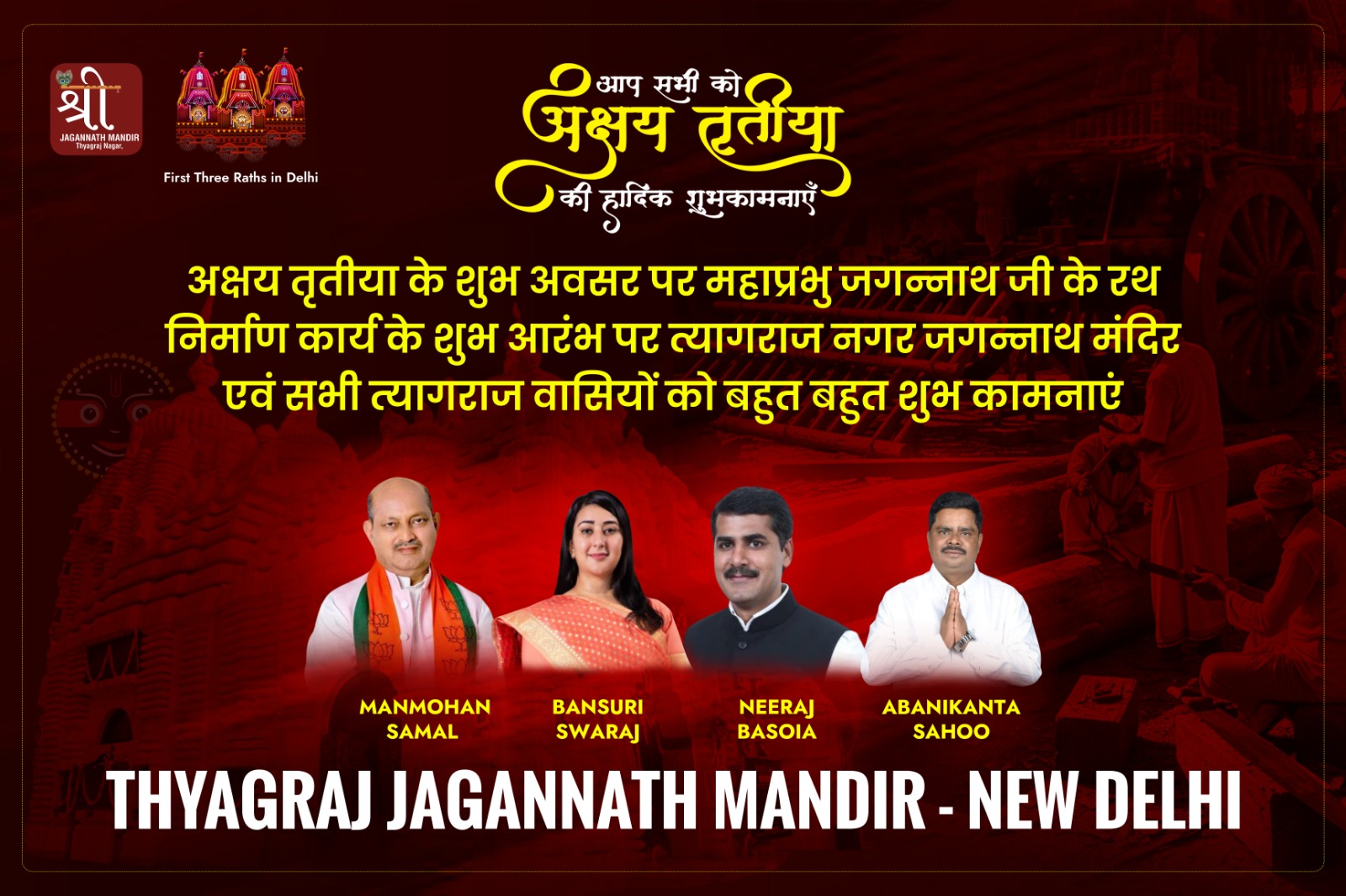 The auspicious occasion of Akshaya Tritiya 2026 marked a truly historic and spiritually significant moment for devotees of Mahaprabhu Shri Jagannath in Delhi and across India. On 20th April 2026, the sacred ceremony for the initiation of construction of three Rathas (chariots) was successfully completed at Thyagraj Jagannath Mandir, New Delhi, following the traditional rituals practiced at the holy Shri Jagannath Dham, Puri.
