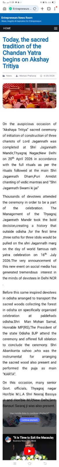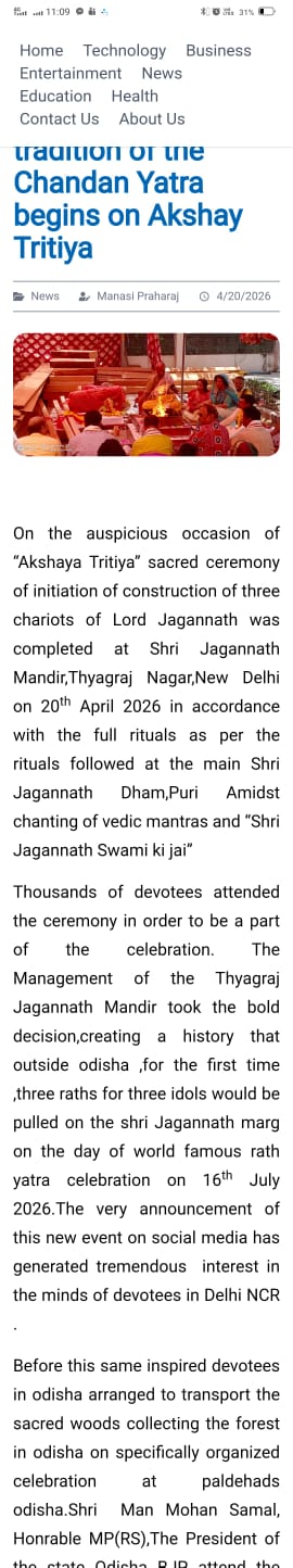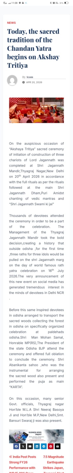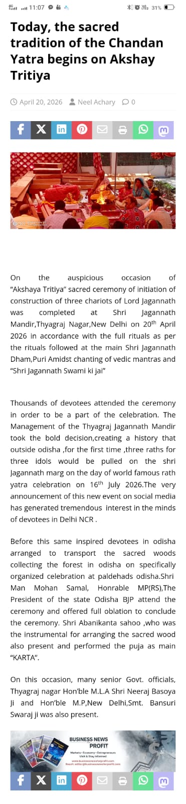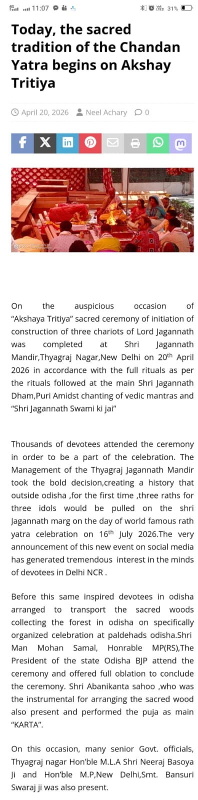 Thyagraj nagar Shri Jagannath mandir at New Delhi is all prepared to construct Three Raths which will reach New Delhi before 20th April 26 ( Akshya Tritiya ) for puja rituals. In the mean time the sacred puja Archana completed on 10the oj April with Hawan puja, Kalash Yatra where thousands of devotees gathered for the Wood puja at Anugul District of Odisha.